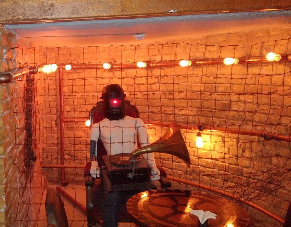 20190627_222115 A robot cranking a gramophone in a Vilnius steampunk bar